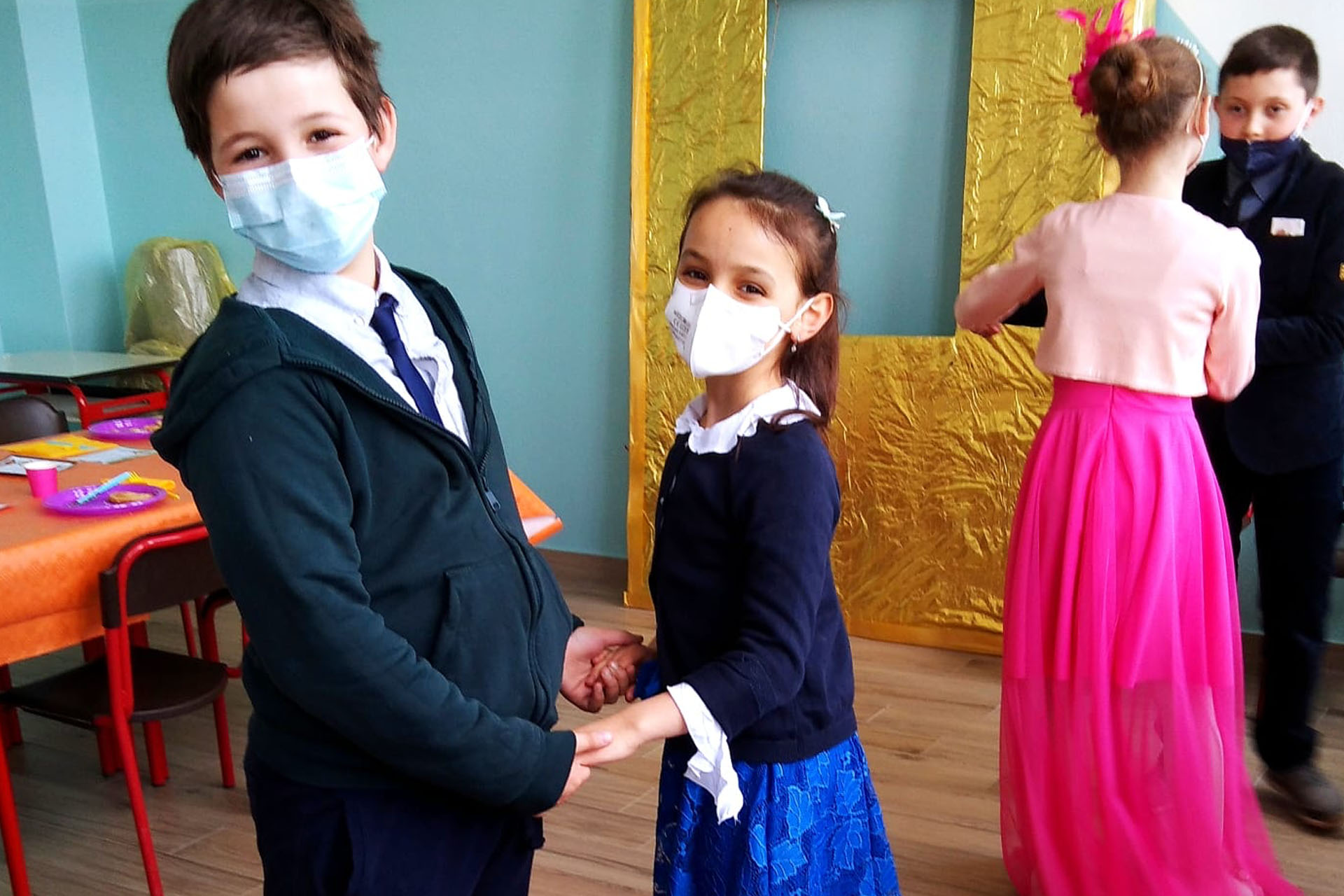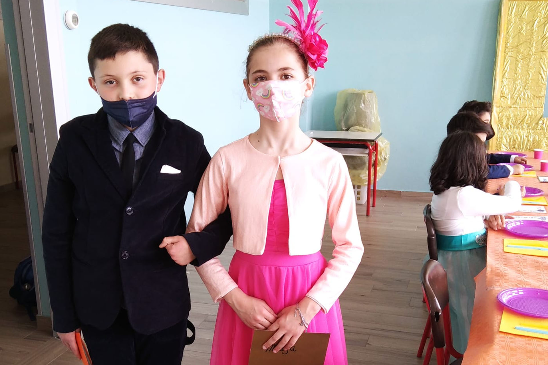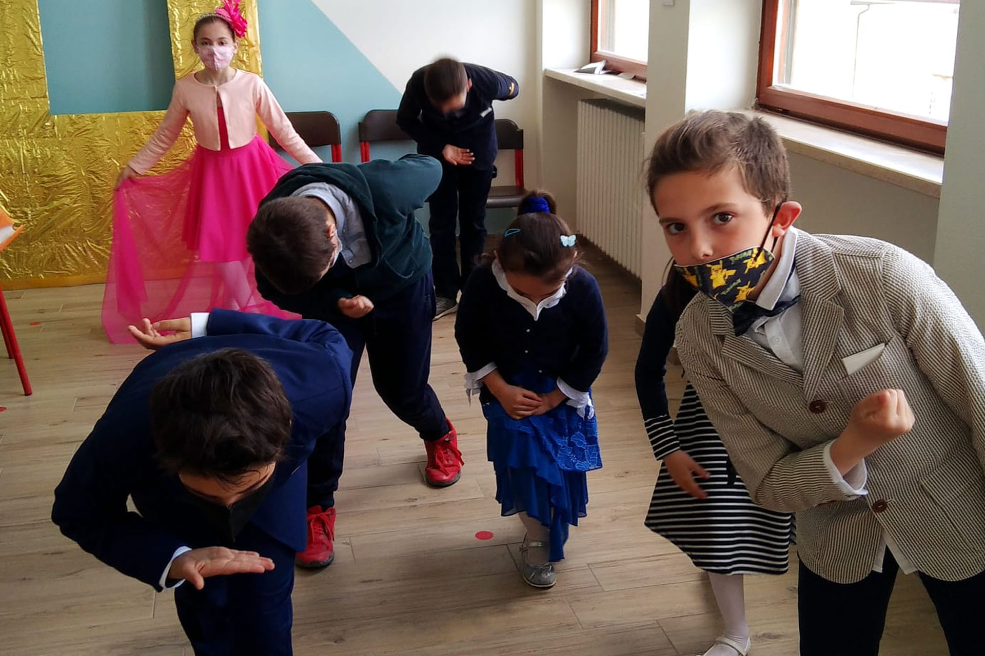 Abbiamo scelto di lavorare su un’attività interdisciplinare: durante le ore di arte si lavora sugli inviti, realizzati icon il carattere regale e la bandiera inglese; in motoria si imparano ilvalzer e i vari inchini per uomo e donna; si imparano le regole di corte, come stare al cospetto della regina (quale comportamento adottare? Che dress-code scegliere? Come utilizzare il body language?)