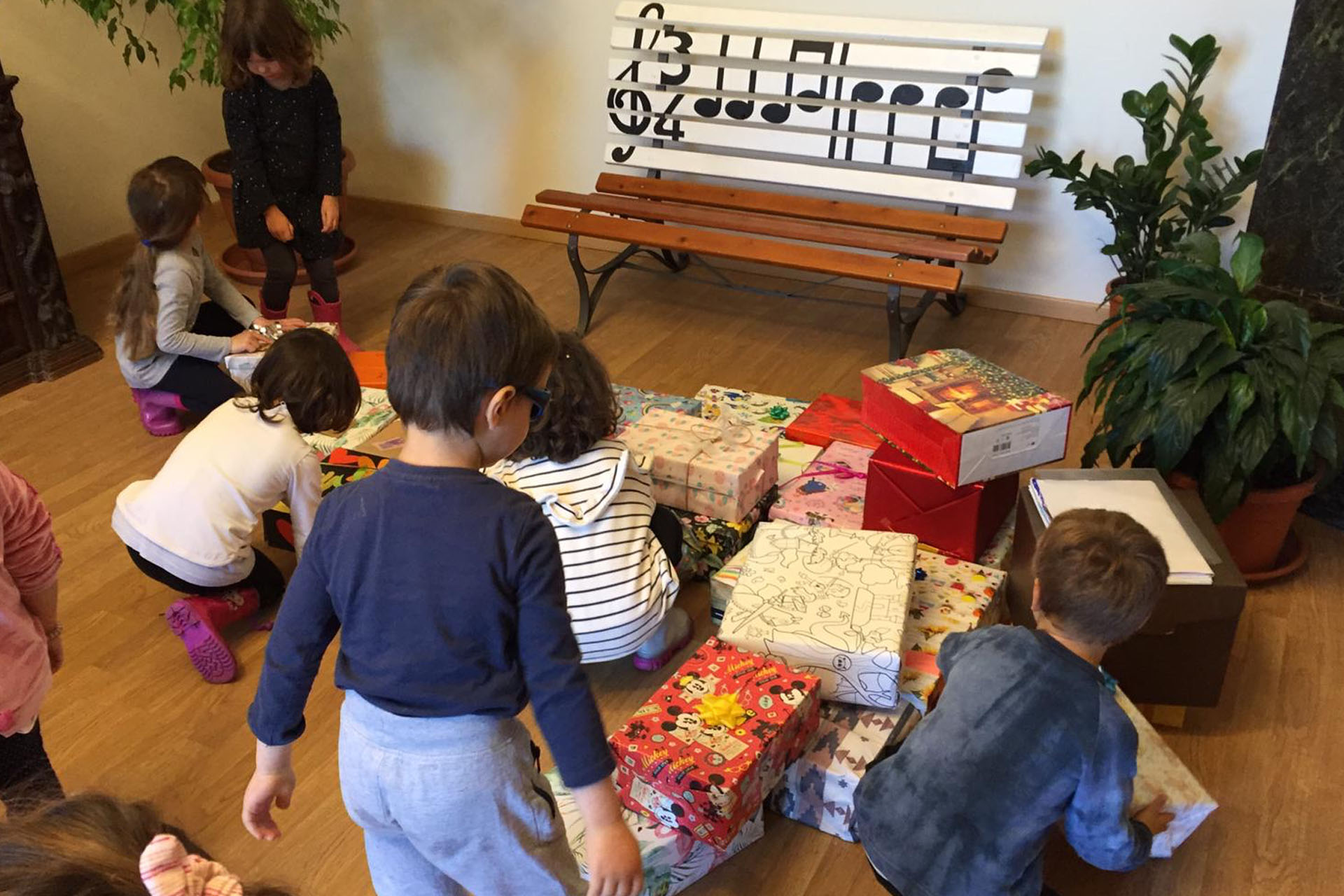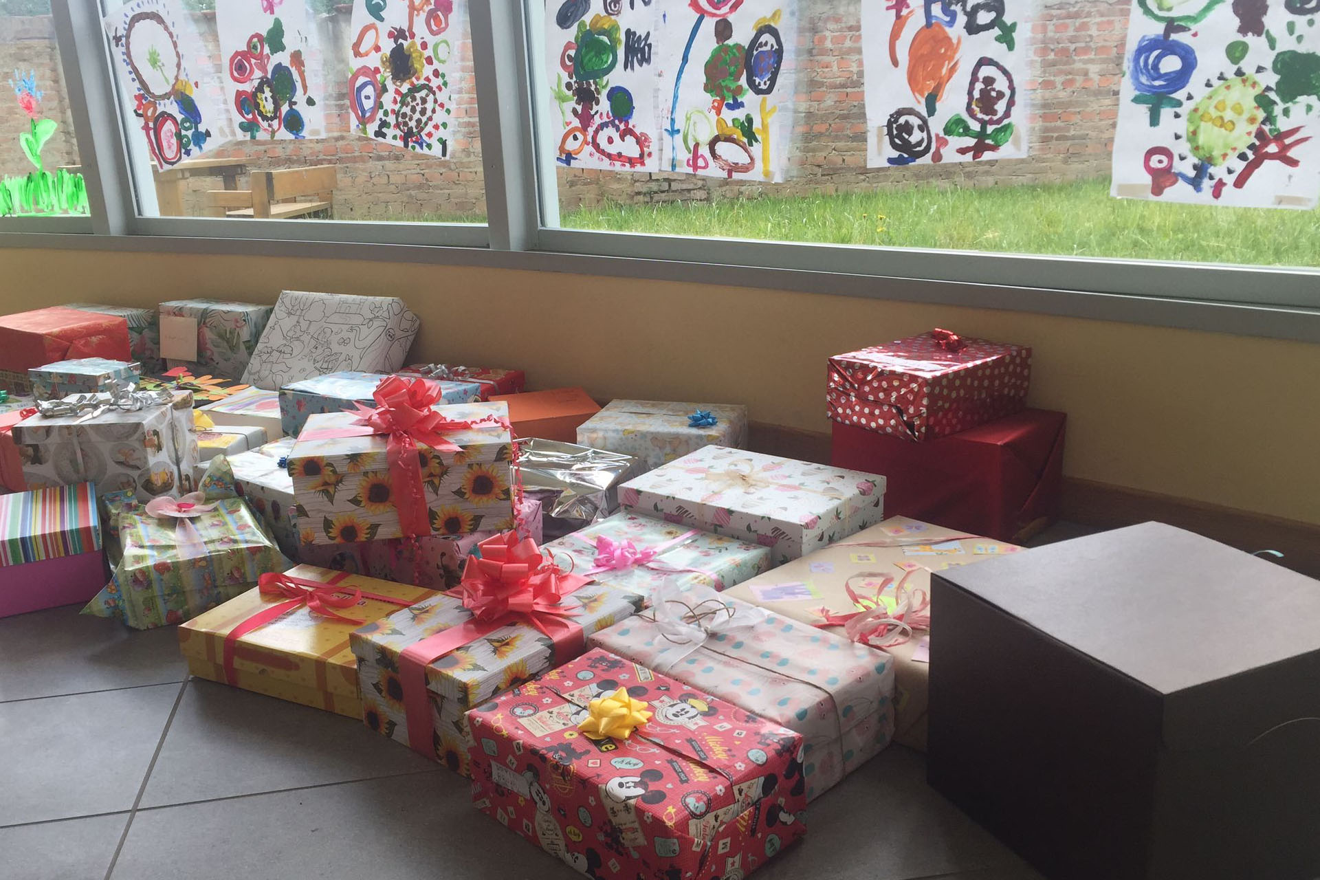 6 maggio, suona la campanella, i bambini si affrettano ad entrare con la loro scatola sotto il braccio; in men che non si dica l’atrio d’ingresso della nostra scuola si è riempito di pacchetti regalo…sembrava di essere a Natale!