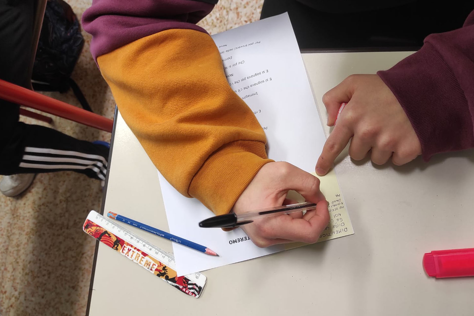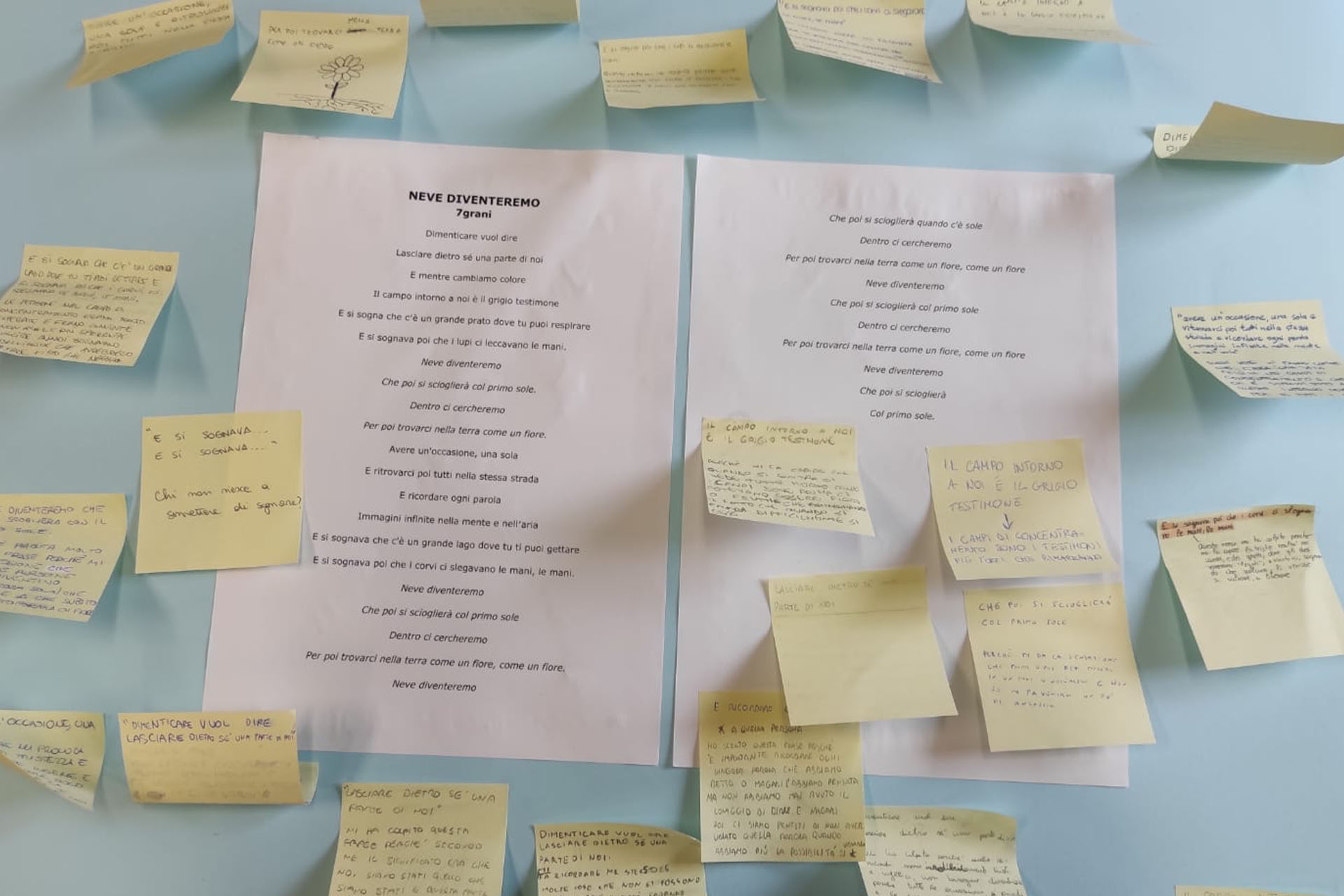 Partendo dal testo del brano ascoltato, i ragazzi hanno dato il via a una discussione, andando poi a scrivere su un post-it il verso della canzone che più li ha colpiti, con la propria motivazione.