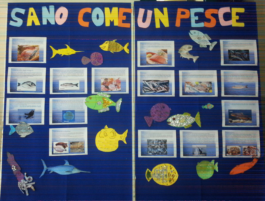 Pesci coloratissimi accompagnano anche i pannelli informativi esposti nell’atrio. Ora ci serve soltanto il sostegno dei genitori nel riproporre più spesso anche sulla tavola di casa questo benefico alimento.